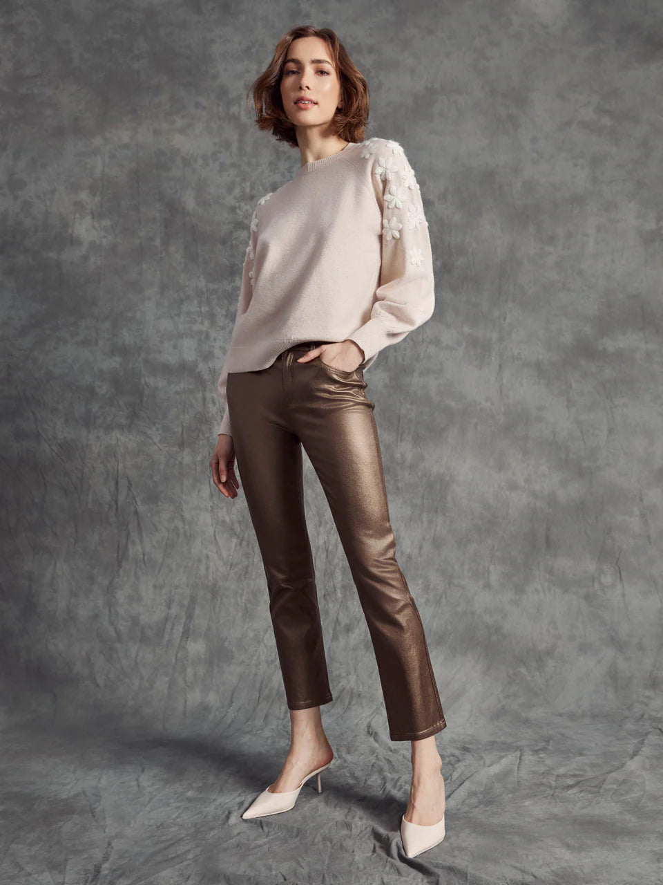 Add a touch of elegance to your fall wardrobe with this crew neck sweater. The charming white floral embroidery on the shoulders and raglan puff sleeves gives a fresh twist to a timeless style. Soft in a heather oat beige color and finished with ribbed cuffs, this piece is both stylish and comfortable.