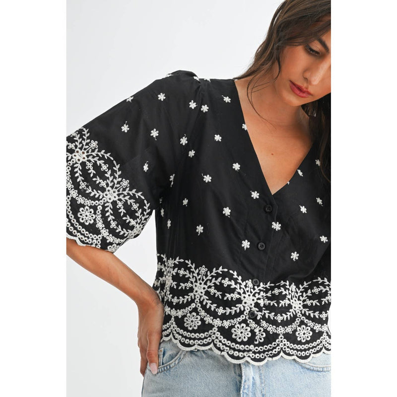 Floral Eyelet V-Neck Button Blouse